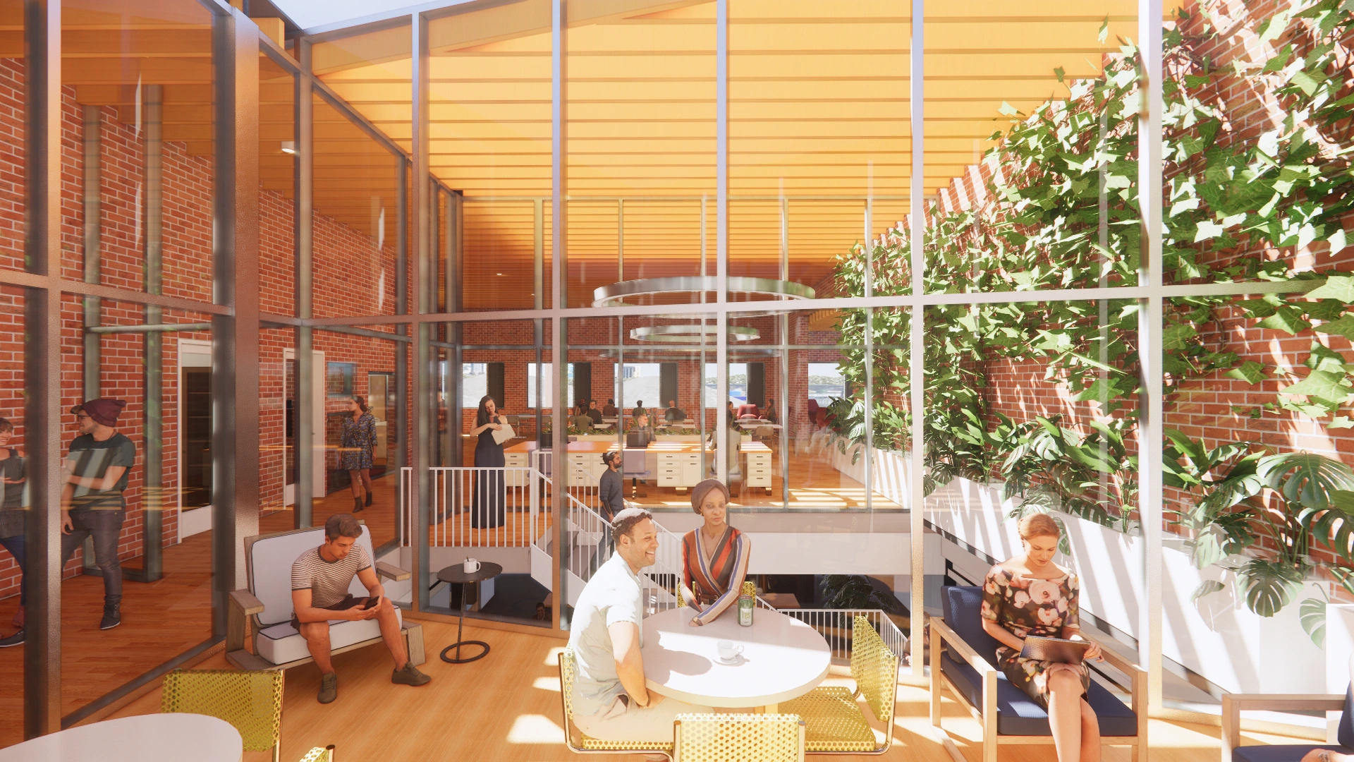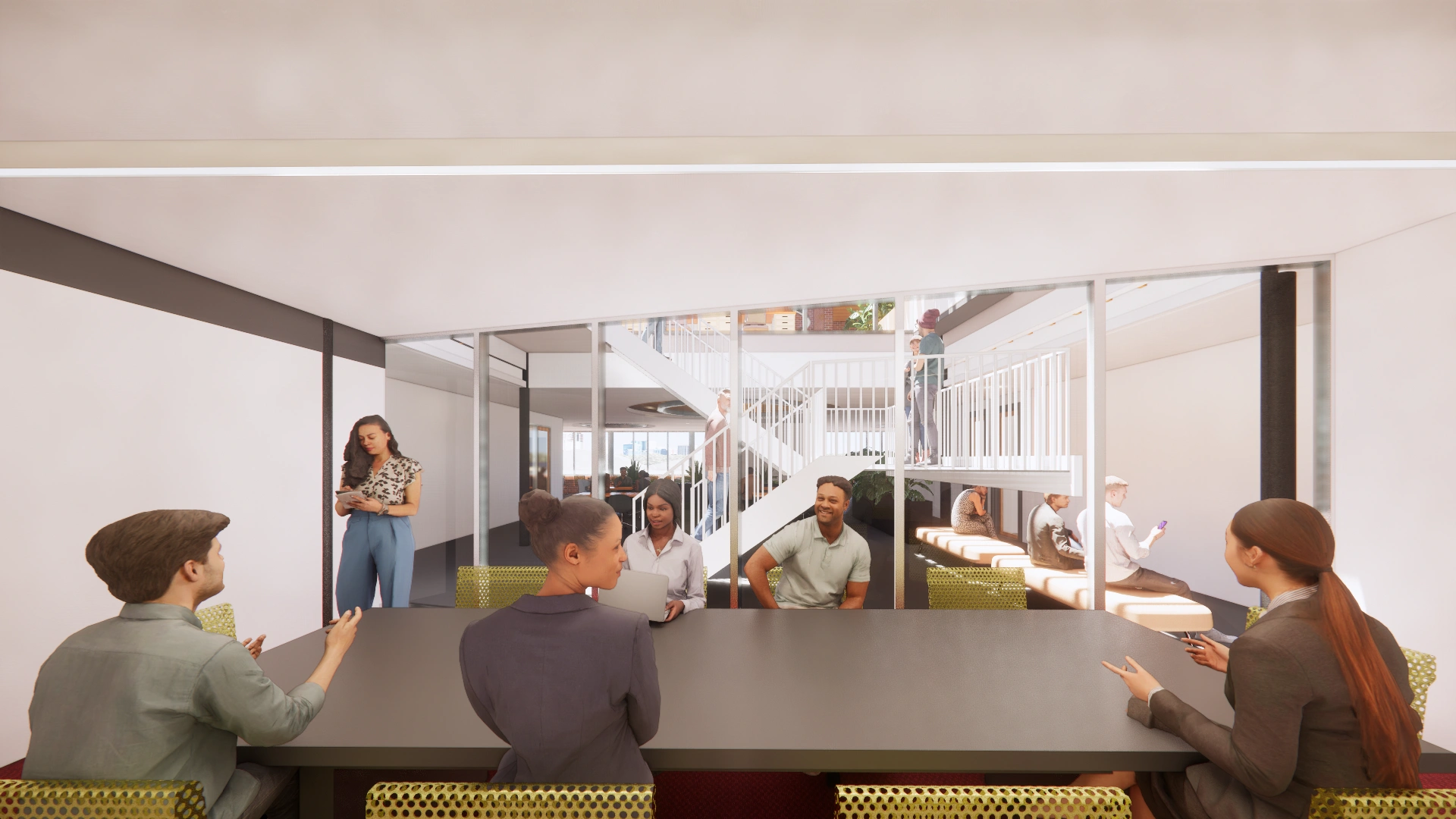 The resulting layout uses an angled centerline through the space to differentiate more public and social spaces from the more enclosed spaces that need privacy.