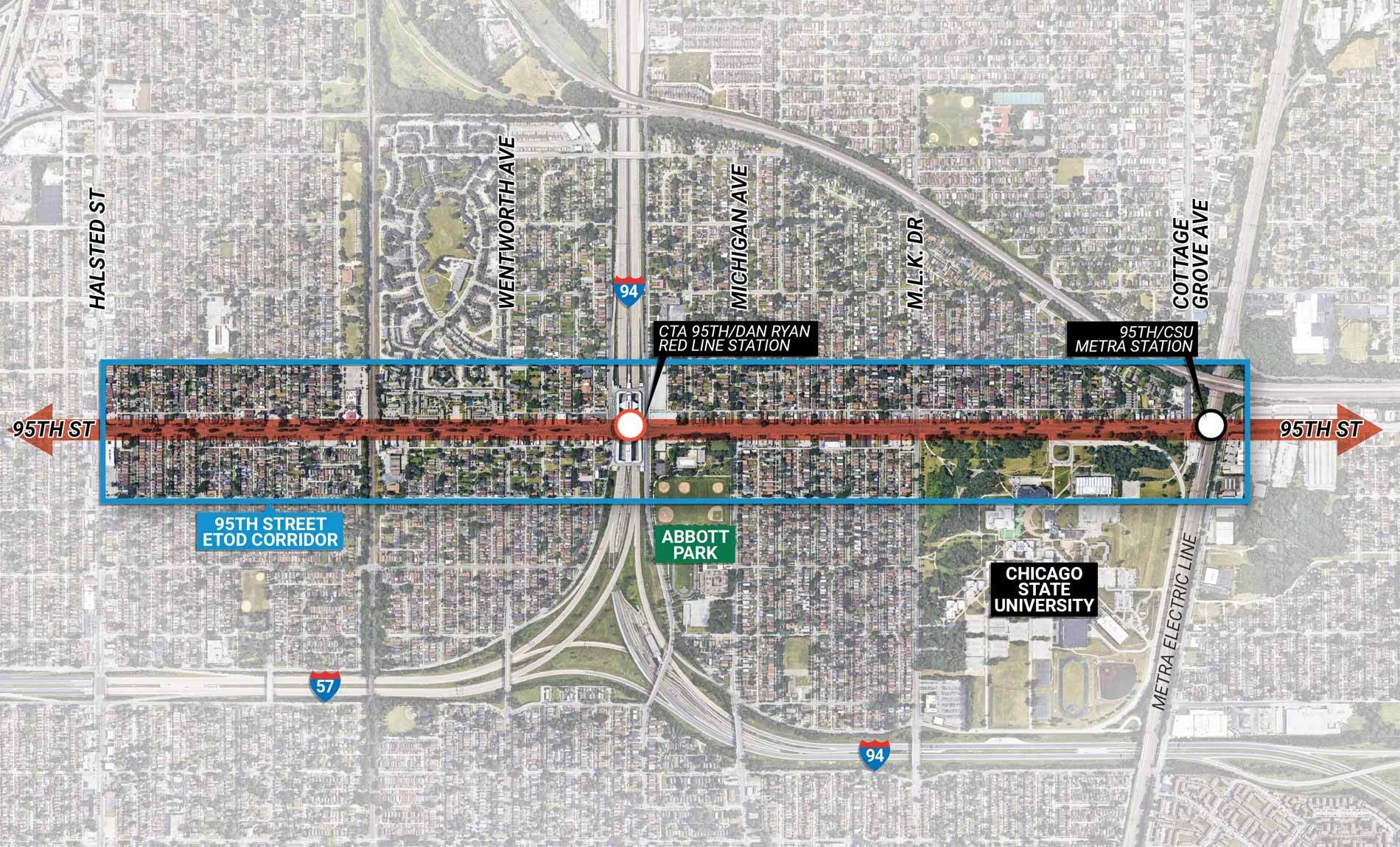 Initiated in early 2023, the 95th St Corridor Plan is seeking to foster equitable Transit-Oriented Development (eTOD) along 95th between Halsted Street and Cottage Grove Avenue. The study is moving forward through a community-driven process that will result in recommendations and goals to guide corridor growth. Topic areas will include land uses, urban design, and policies to foster vibrant and transit-oriented mixed-use improvements. Once finalized in late 2024, the plan could be presented to the Chicago Plan Commission for formal adoption.