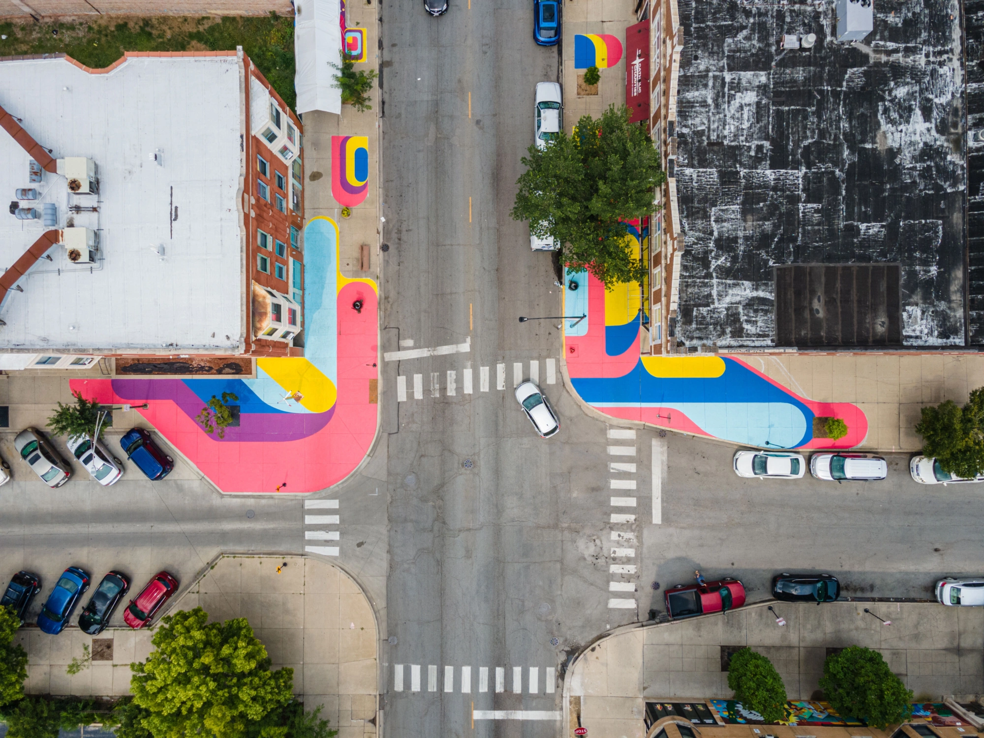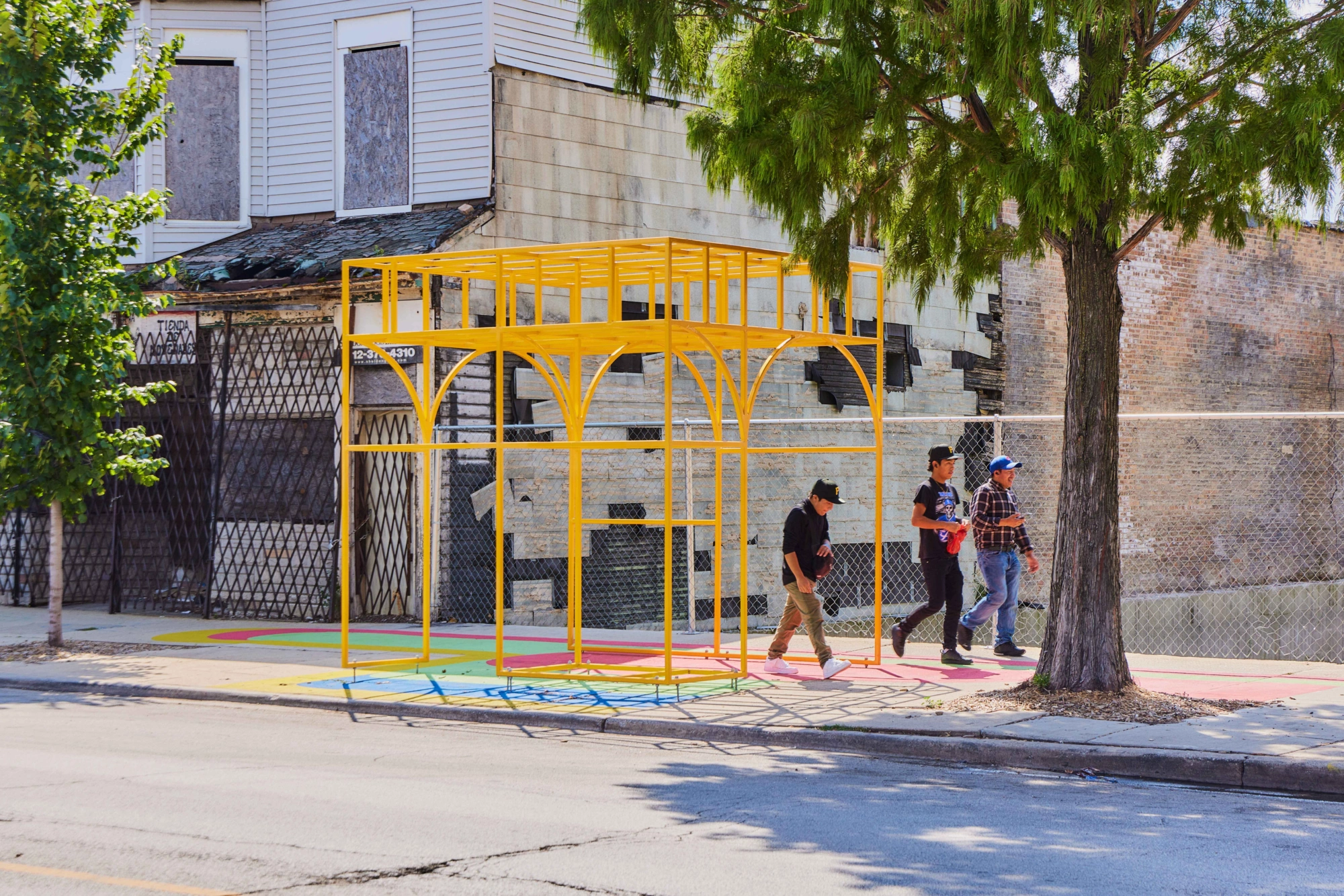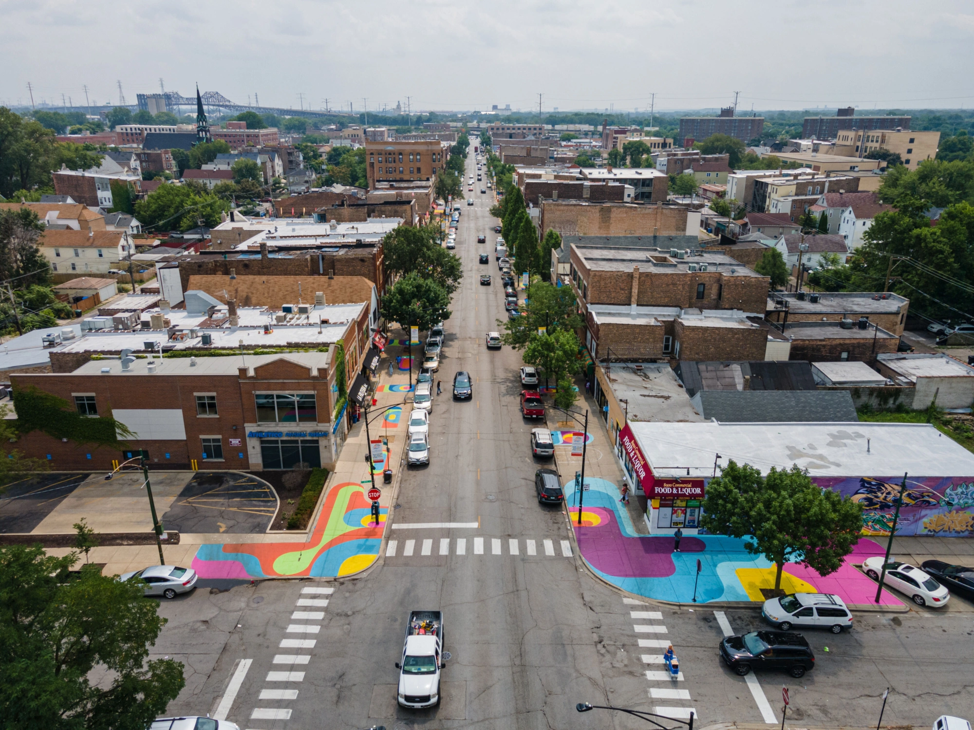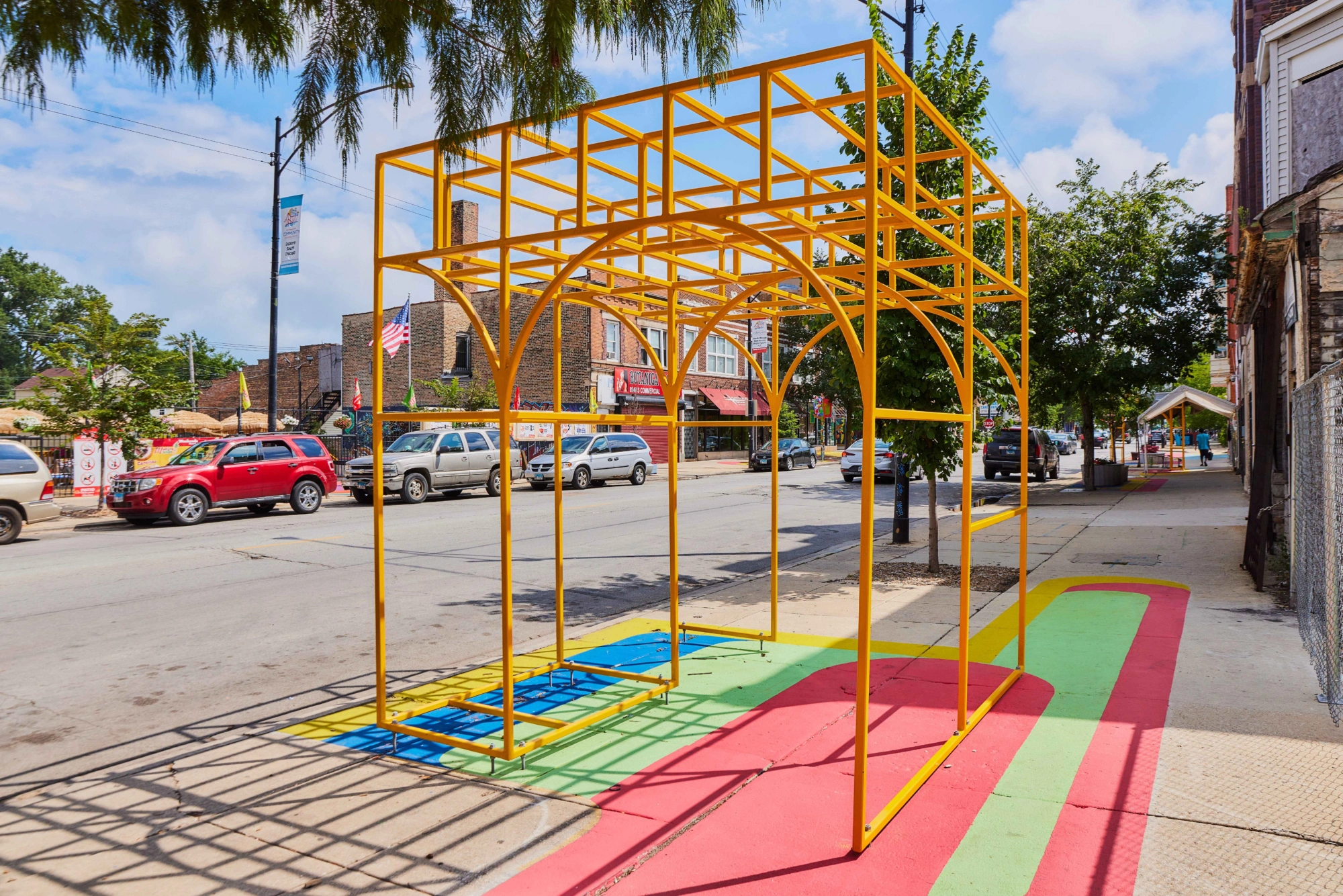 The goal is to create an inviting, walkable district that encourages residents to gather and stroll while reflecting local voices through art. Featuring four zones that house different types of activations, Alfresco South Chicago includes art stacks, mart stalls, seating, and ground graphics.