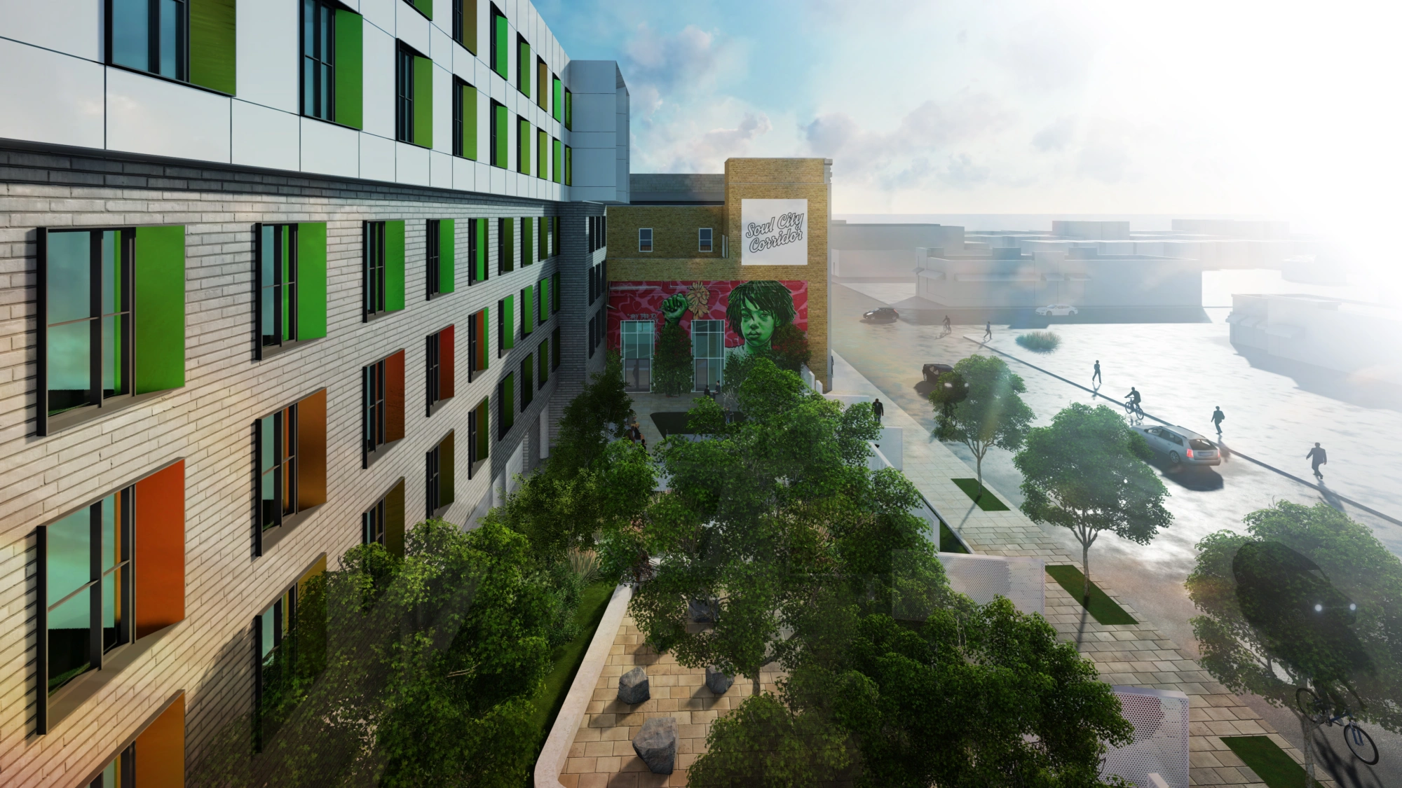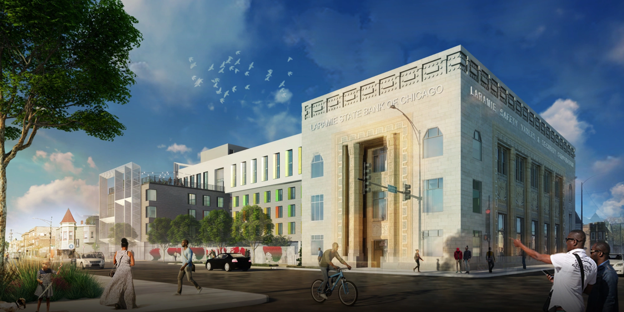 The goal of this project was to create a place that is not only in Austin but and for Austin. A localized design that celebrates Austin through art, architecture, and a compelling narrative. A CDC model that owns, operates, and profits from the commercial/retail spaces. The landscaped courtyard creates new public green space and hub for Chicago Avenue in Austin.