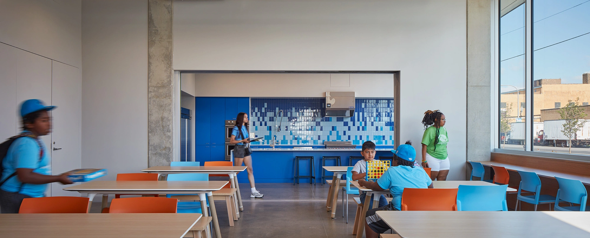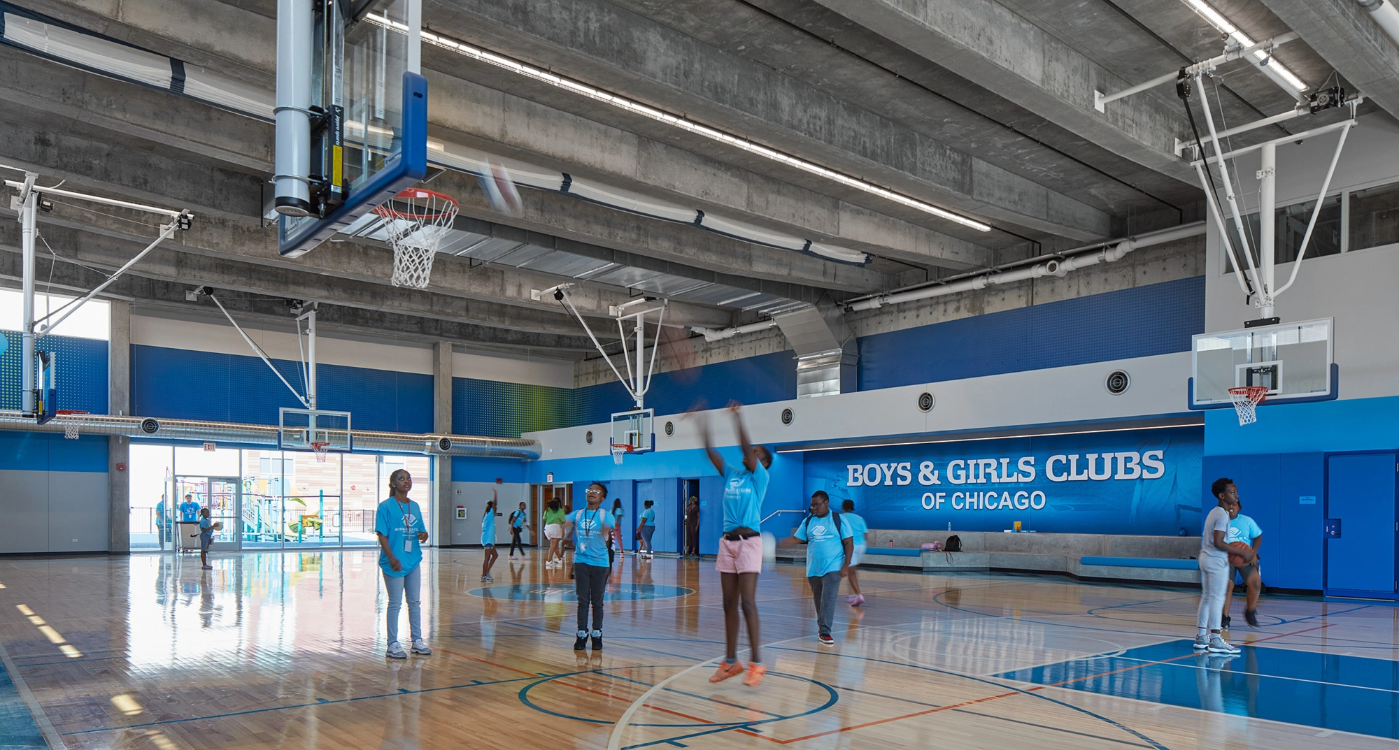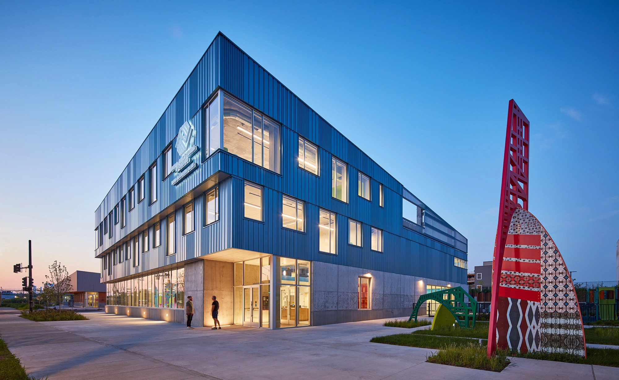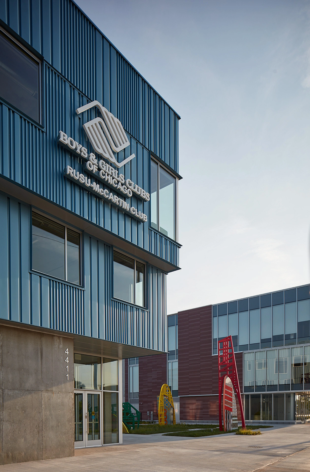 The new Rusu-McCartin Club is the first new construction Boys and Girls Club in nearly 50 years and will anchor the Joint Public Safety Campus in the Austin neighborhood on the West Side of Chicago. The 3-story building provides facilities for local youth to engage in a broad offering of programs that promote leadership development, academic success, and healthy lifestyles. The building activates Chicago Avenue with large expanses of glass to showcase the various creative programming across three stepped floors. The front of the building is angled to create a landscaped east to west pathway across the campus and reveal skyline views from the entry and public plaza. On top of the double height gymnasium sits an outdoor deck adjacent to a growing meadow and a large flexible classroom space. The exterior skin of the building is comprised of a variable pattern of three metal profiles with metallic paint finishes to capture sun and shadows throughout the day.