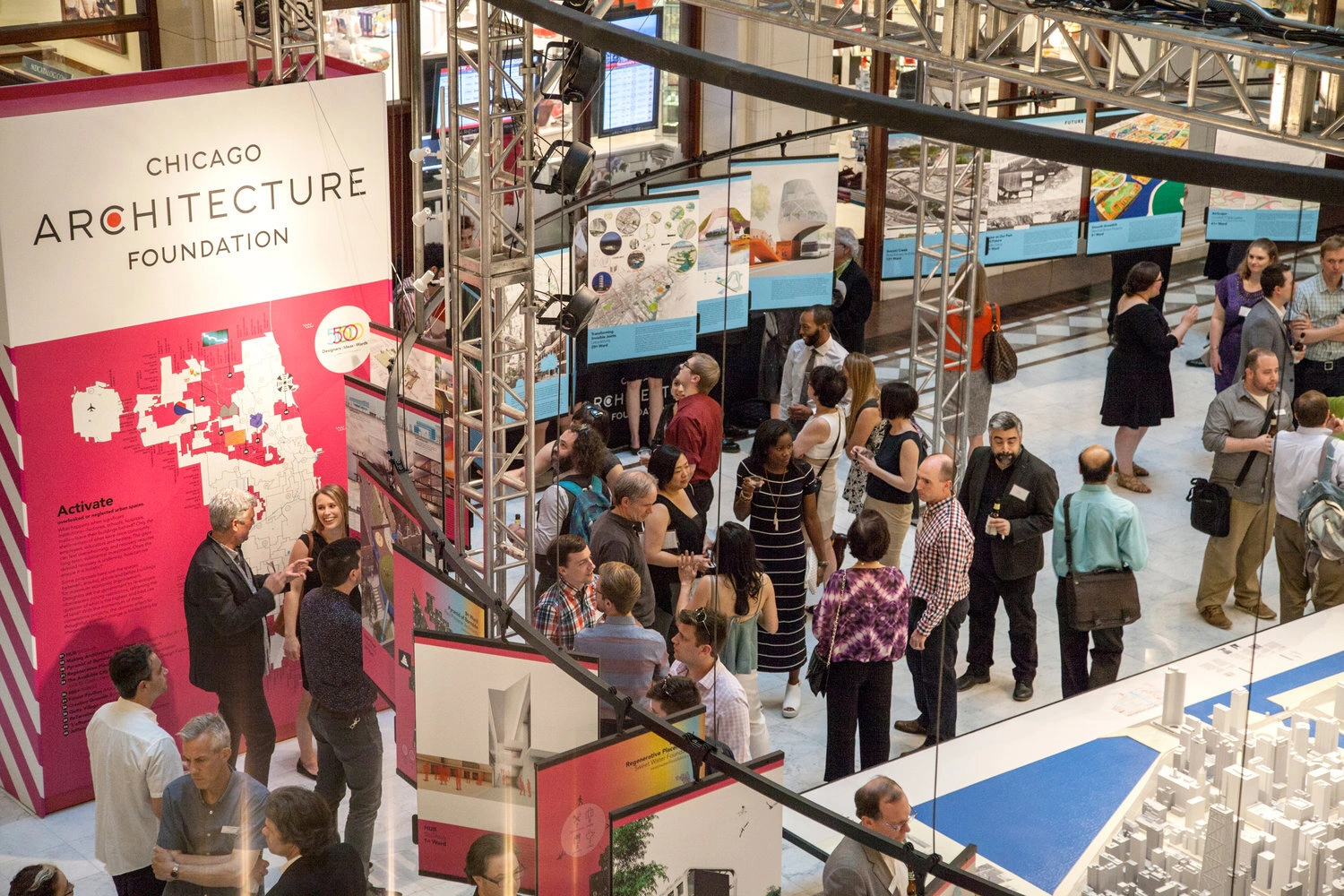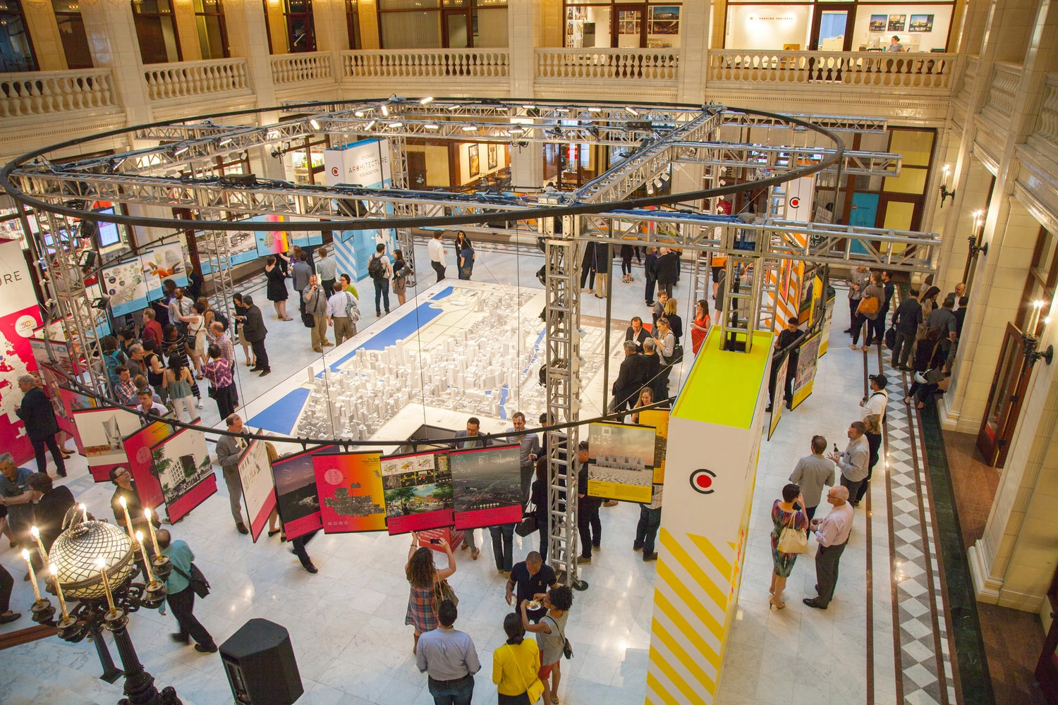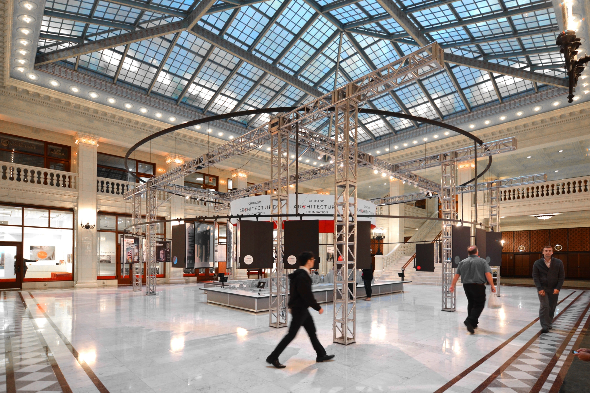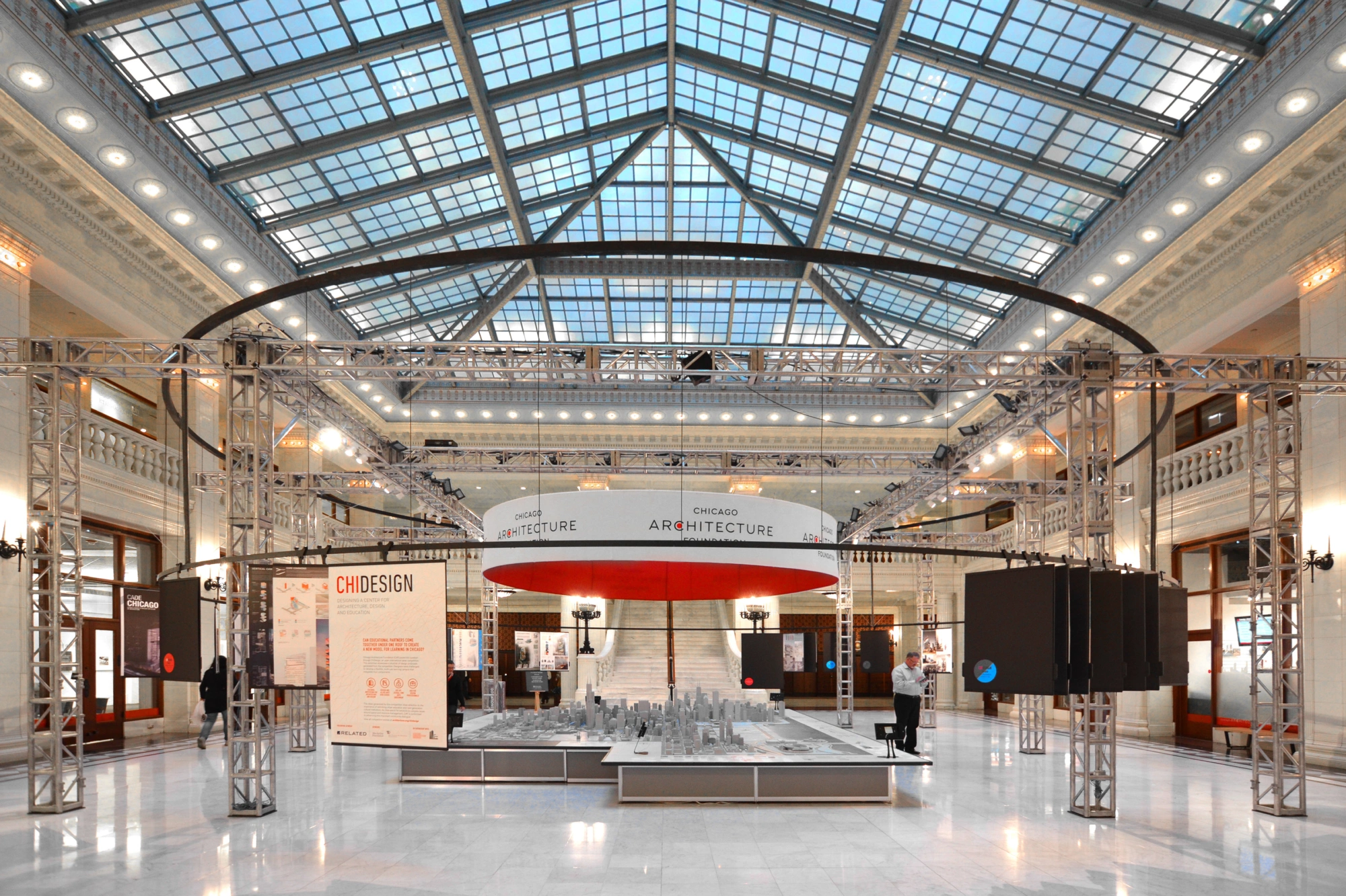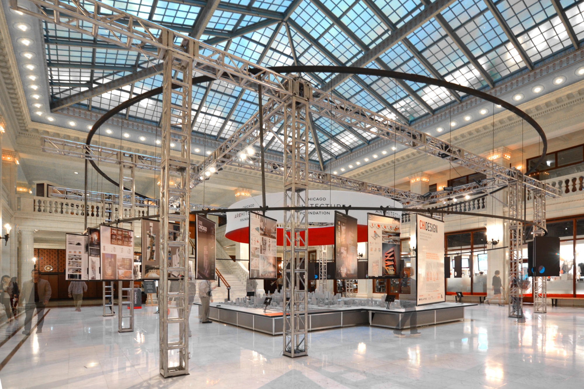 Latent partnered with the Chicago Architecture Center to design an exhibition to showcase 50 transformative proposals for building a better Chicago. These proposals were curated by Martin Felsen, Sarah Dunn, and Reed Kroloff who tapped distinguished architecture + design firms throughout the city to create a new vision for each ward. Latent engaged Active Alloys to fabricate a unique 44-foot circular display track that encircled CAF’s Chicago city model in the atrium of the historic Railway Exchange Building. The display track utilized the existing lighting structure + a bespoke roller + attachment system to accommodate one double-sided board for each of the 50 architects selected to design ward-specific projects. Latent’s Boombox micro-retail project was featured in the 6th Ward.