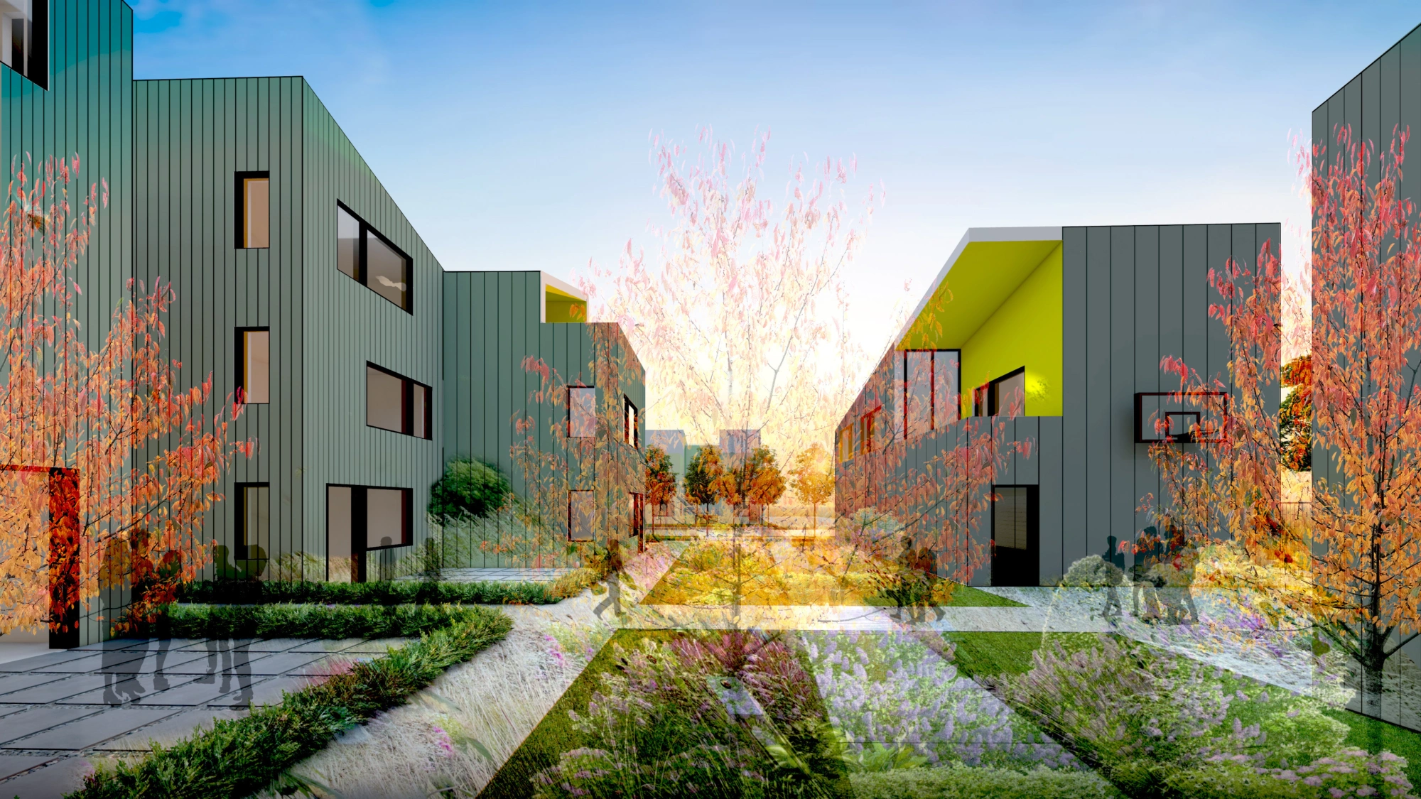 Row House block concept illustrates varied solar roof orientation, massing, and meandering shared outdoor spaces.