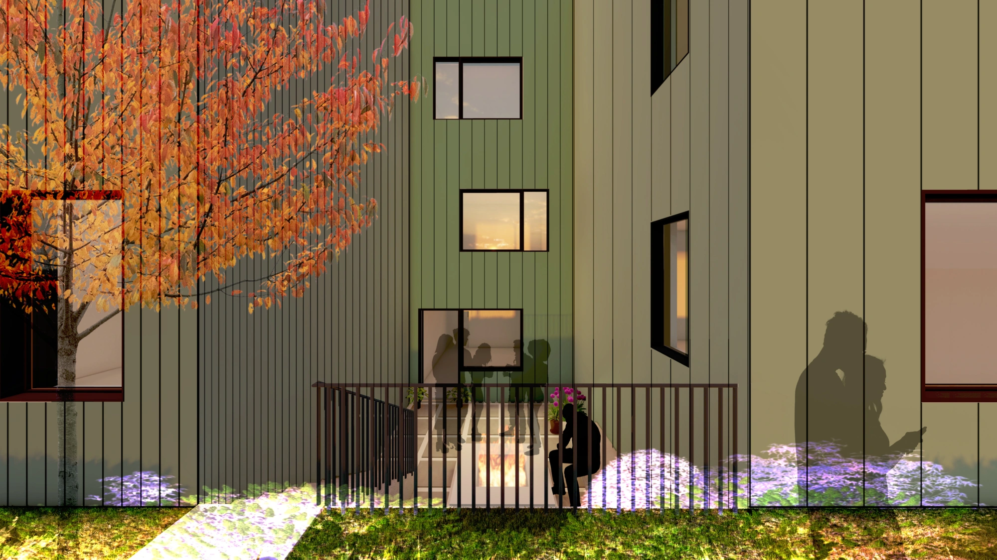 Made possible by the recently revised building code, six rowhomes have been arranged on the site to create a central pathway to access the aging-in-place units and ADUs. This pathway connects a series of outdoor spaces that range from still, formal, and neatly presented front yards to a communal, active, and social backyard. Each Rowhome + ADU is designed as an all-electric home with heat pump heating & cooling + balanced ventilation using ERV's. The building massing and roof line shifts and creates variation over several blocks without changing the floor plan. In this future of community wealth, a resilient block employs sustainable practices to protect environmental, financial, and social equity for generations.