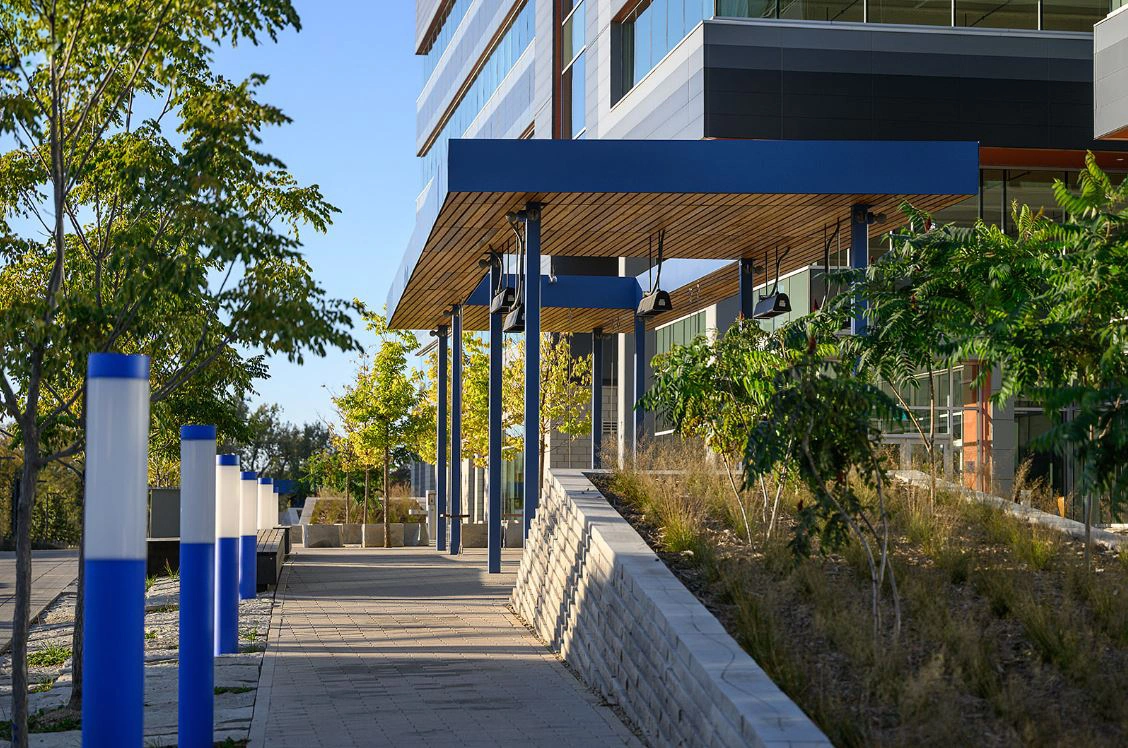 13 columns support a dramatic cantilevered pavilion defining the gateway to the Destination Medical Center
