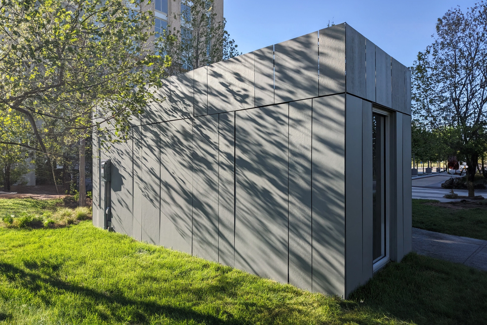 Full height 3'-6" x 11'-0" panels shingle vertically around the container to create linear rhythm + shadow relief.