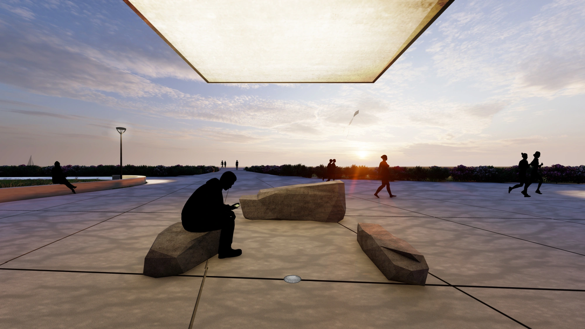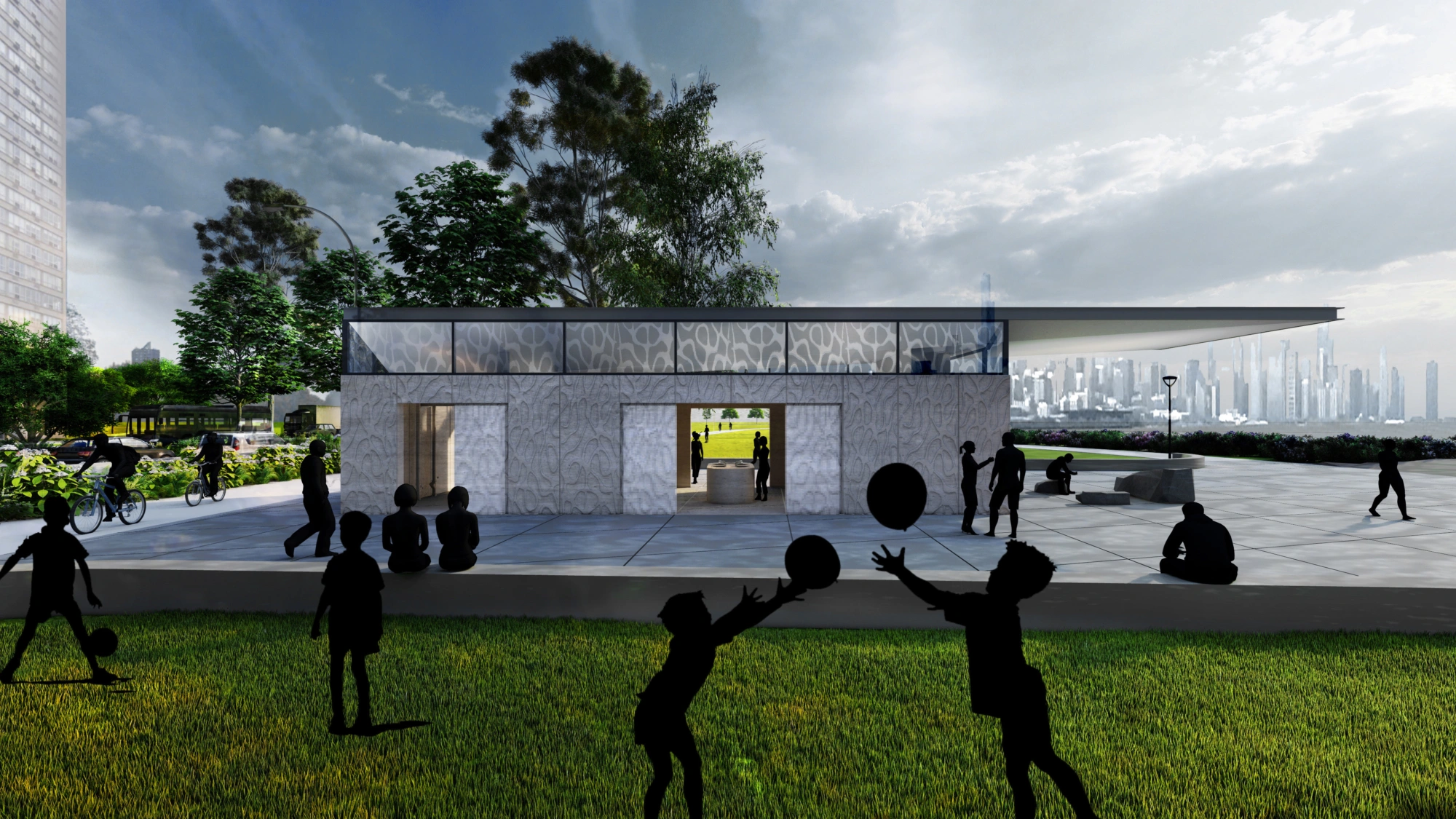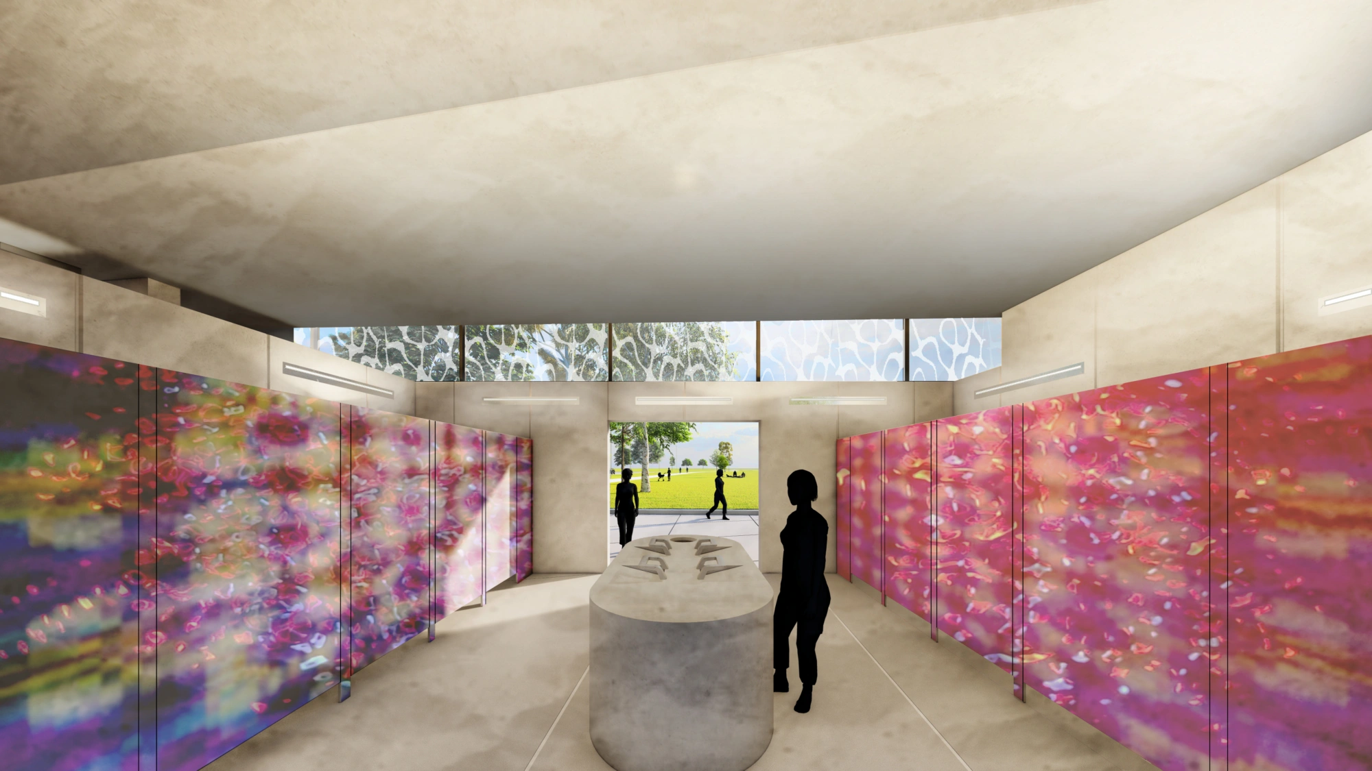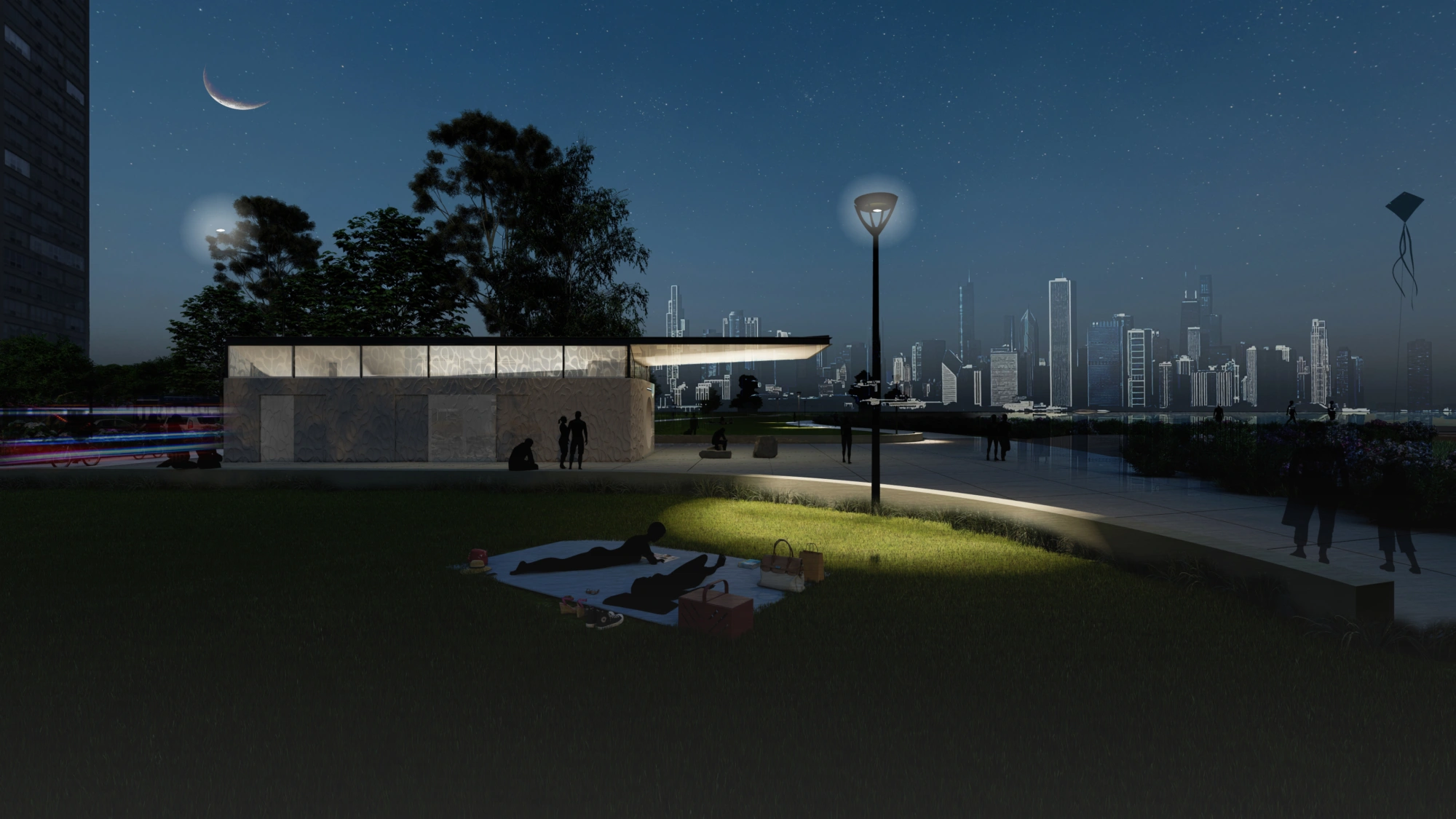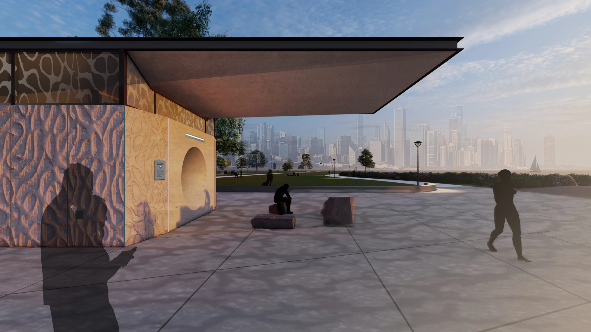 The Morgan Shoal Comfort Station will soon replace a notable landmark along the shoreline of Lake Michigan. Drawing inspiration from historic Chicago Bridge Houses. The design features a continuous clear story window that allows natural light to activate the space during the day while serving as a captivating beacon, accentuating the up-lit cantilevered roof surface in the evening. This distinctive concrete roof plane will float above the city skyline, serving as a distinctive marker for lakefront recreation while offering a tranquil escape away from the noise + restlessness of DuSable Lakeshore Drive. Our focus was to seamlessly re-incorporate the historical site-specific carved limestone blocks while referencing the vibrant colors of the iconic artwork from the old comfort station. Latent Design makes the invisible visible with each bespoke project location + historical context. As such we have creatively embraced the concept of sound + frequency, translating the ever-changing nature of the lake into a tangible texture that defines this building's facade. Collaborating with the esteemed artist Mark Holt, we have commissioned custom form-lined concrete panels + frit patterns that echo + reinterpret the sound patterns of the lake, creating a visually stunning + artistically robust structure. To pay homage to the harmony and vibrancy of the lake, we will integrate colors derived from the artwork displayed on the original comfort station into the interior partition panels. A sound mirror positioned beneath the cantilevered roof, facing the lake, will serve as a captivating reflection of the constantly evolving soundscape of Lake Michigan throughout the year.