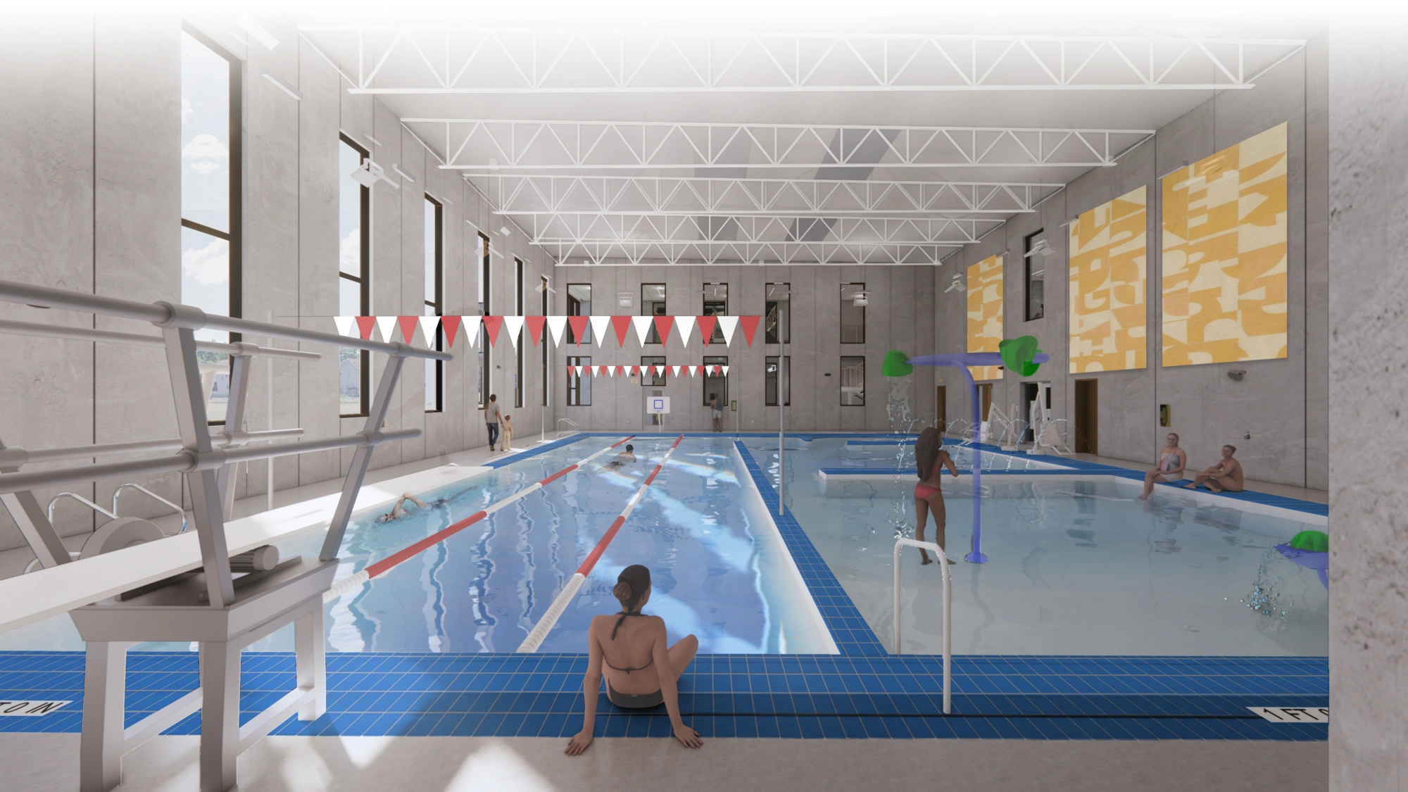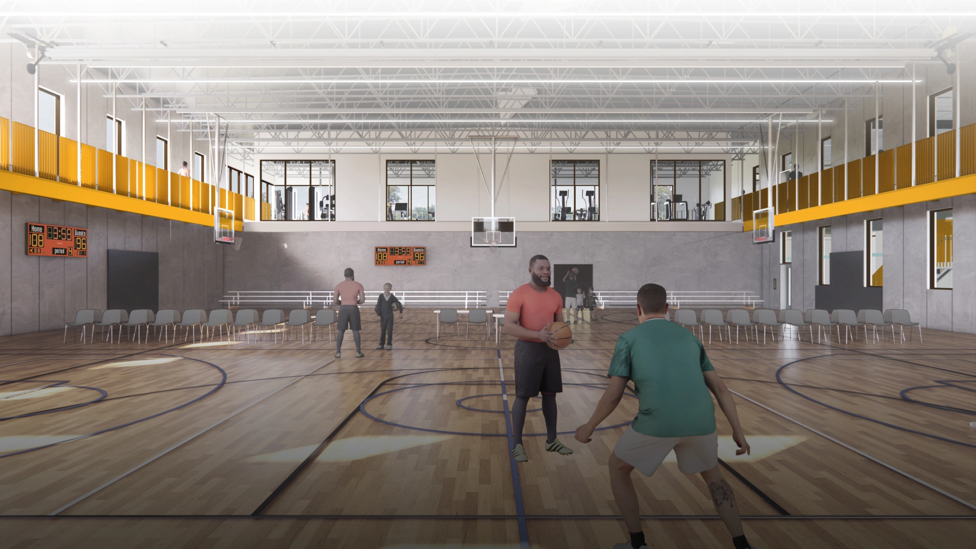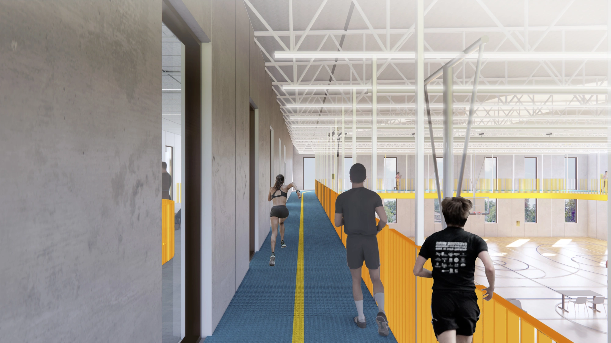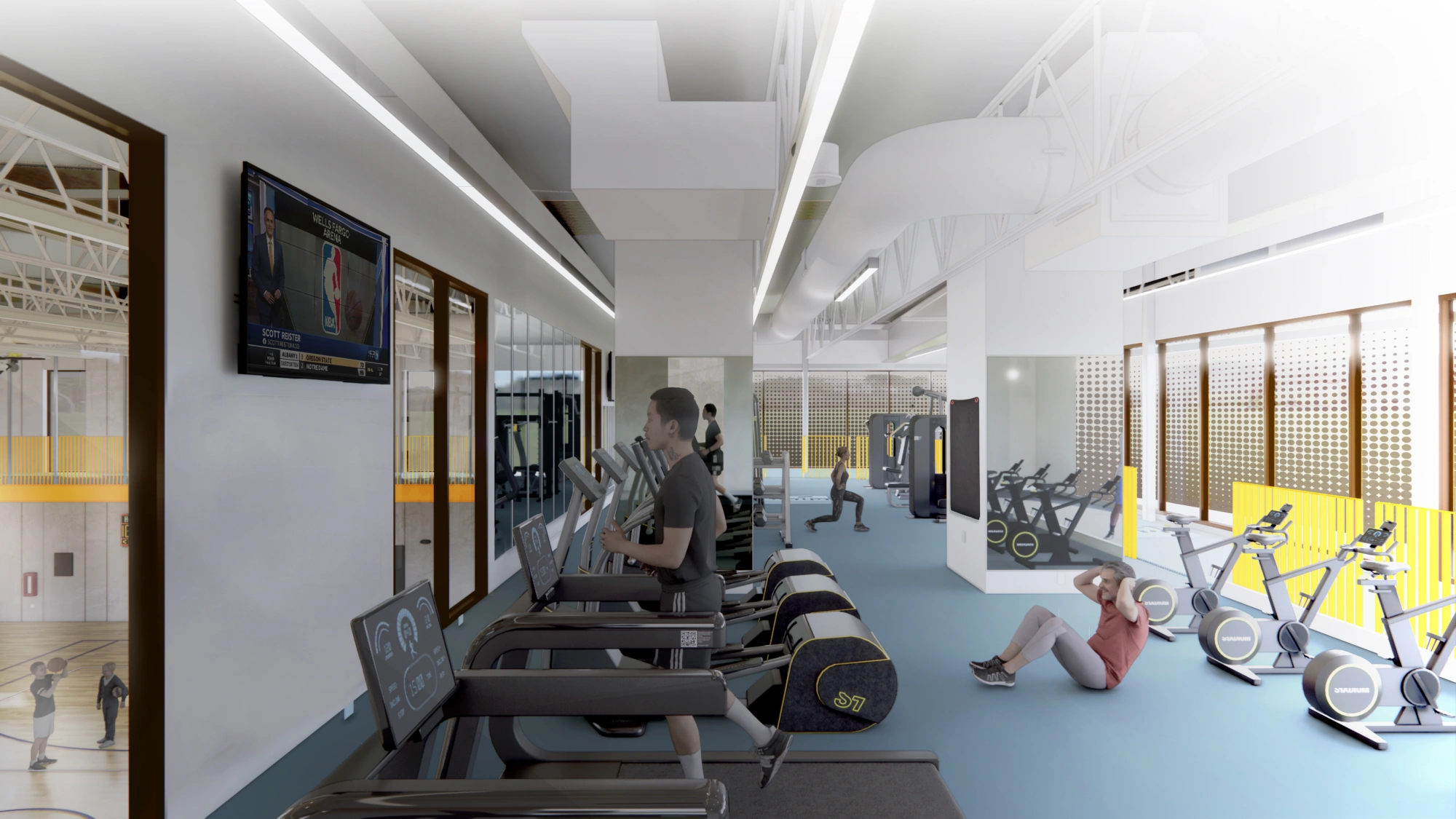 The circulation spine divides and visually connects the gym and pool functions